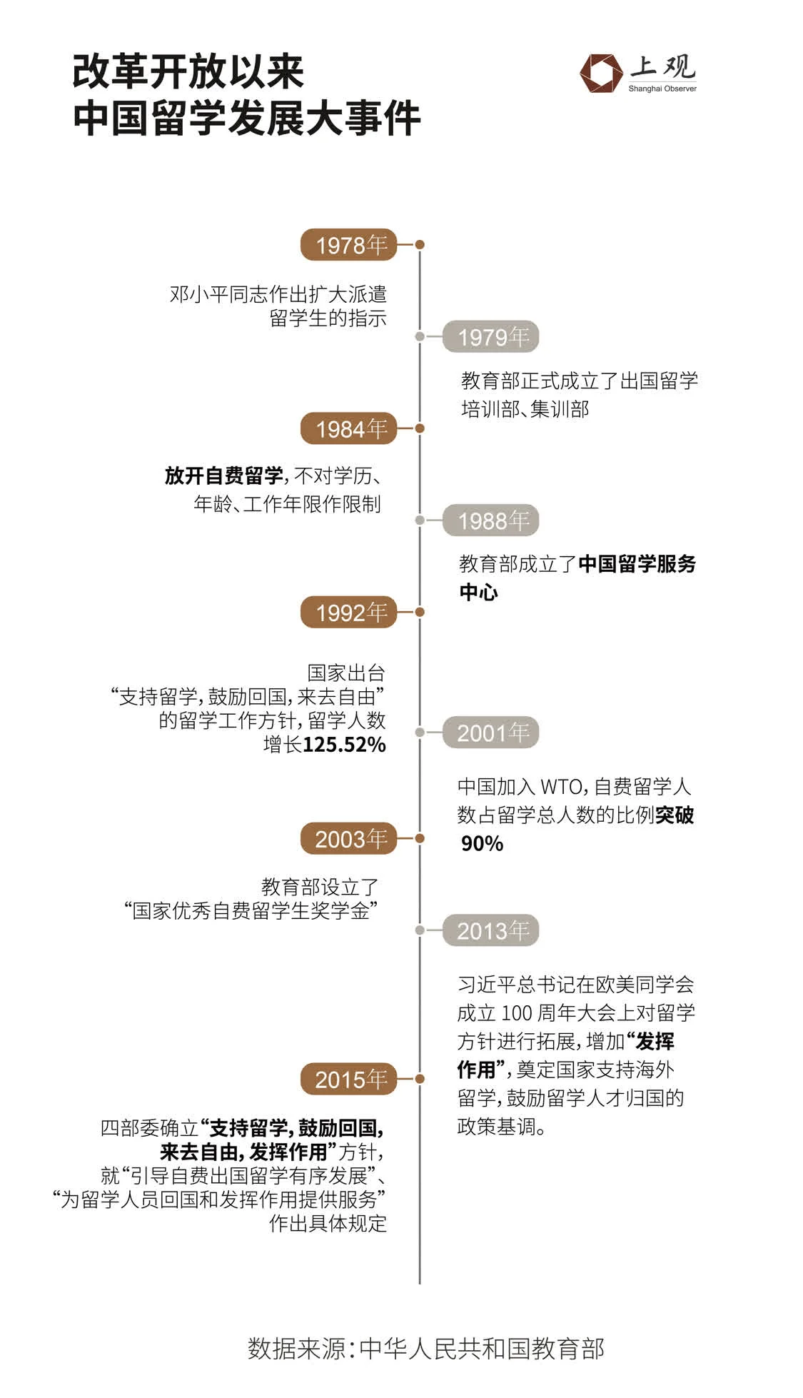 1978年,鄧小平同志在聽取了教育部彙報清華大學工作時,作出擴大派遣留學生的指示。1984年,中國正式放開自費留學,不再對留學者的學歷、年齡和工作年限作出限制,留學人數開始逐年增加。2001年中國加入 WTO,自費留學人數達到 7.6 萬人,同比增長 135.31%,佔留學總人數的比例突破 90%。近20年來,出國留學人數從不到4萬人增長至2019年的70.35萬人,雖然疫情期間有所回落,但2022年又逐步恢復至66.21萬人。