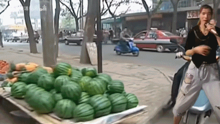 先是經典重現,在一聲聲哦賣 K 中,權妹走向賣瓜老闆,結果發現不僅缺斤少兩,瓜的質量還不好,於是站上瓜攤舞了起來。