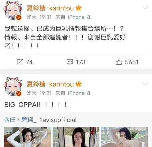 接着這則推文不久後,夏鈴糖使用了“偽中國語”表達出自己對於巨乳與大屁股的喜好,引發了國內網友的共鳴。