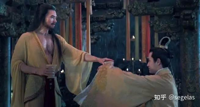 並且,這一幕也與妲己誘惑紂王的“權欲”高度相關。同樣面對質子與權位,彼時剛剛接觸妲己的他尚且能夠保持表面的正面態度,在初回王宮的時候對上位者父兄表示尊重,對殺死兄長的姬發也“反規則”地開恩,沒有看作棄子,維持了反血脈的父子關係。而隨着時間的推移,到了面對謀逆者伯侯時,他乾脆地滅殺了質子。在這場戲中,電影比較巧妙地處理了他潛在的轉變。質子們將反叛侯爵們帶到大殿,紂王依然試圖衝破血脈關係的桎梏,與開場時蘇全孝一幕比較類似。但他的具體做法卻已經非常不同,讓兒子直接殺死生身父親,否則便毫不遲疑地自己動手處決對方,已經沒有了開頭時對蘇全孝“對方自願,自己悲痛”的父子情深。紂王的表面行為,依然在他自以為的“一貫自我意志”中對抗着“既定”,但實際上則已經更加殘暴,接近了昏君的結局---在這一幕的結尾,紅色的天命再次出現,而且已經是徹底的血色。