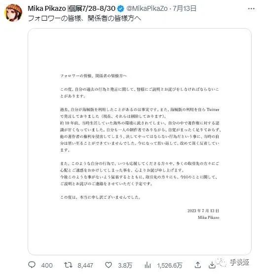 Mika支持盜版的言論目前已經刪除了,並發表了道歉信。