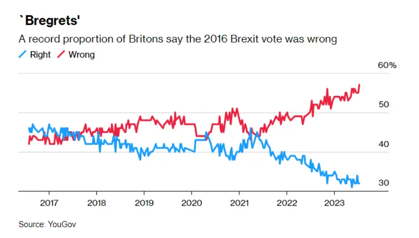 民調顯示,超半數英國人認為脱歐是錯誤的,創下該機構相關民調的最高紀錄。圖源:YouGov