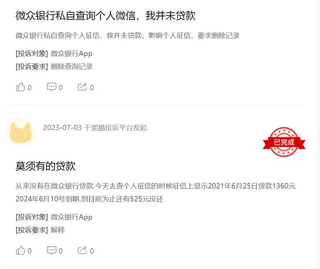 類似的投訴,僅過去一個月就有近10條。7月14日,一位用户投訴稱,微眾銀行於2023年5月28日未經允許查詢了其徵信並留下了貸款審批記錄,但其本人從未申請過任何平台的貸款而且信用徵信一直非常好。