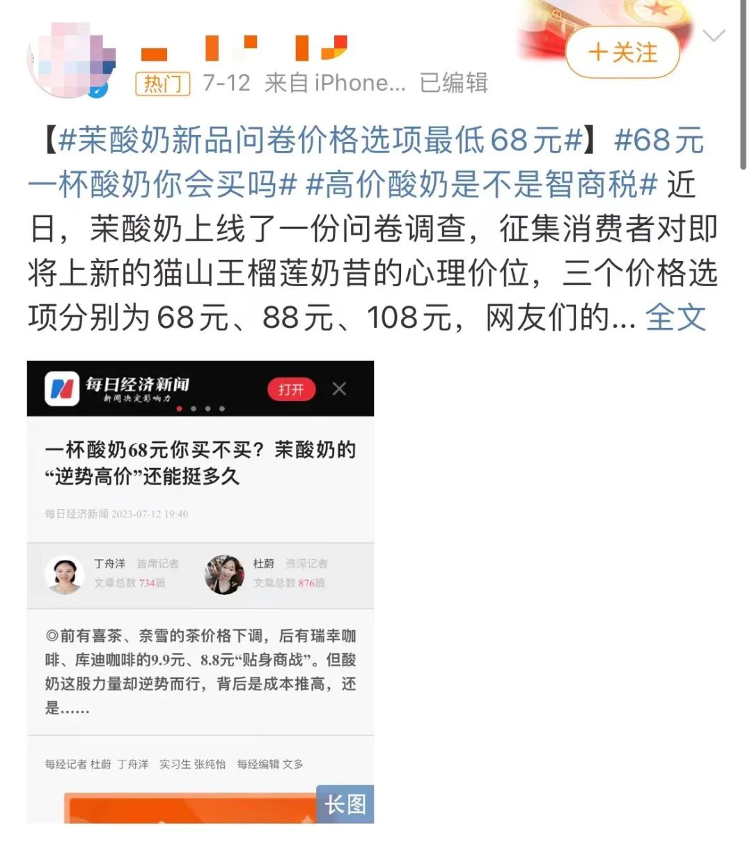 比如前幾天,茉酸奶因為貓山王酸奶最低68元,最高128元,僅僅讓網友做價格投票,就被推上風口浪尖。