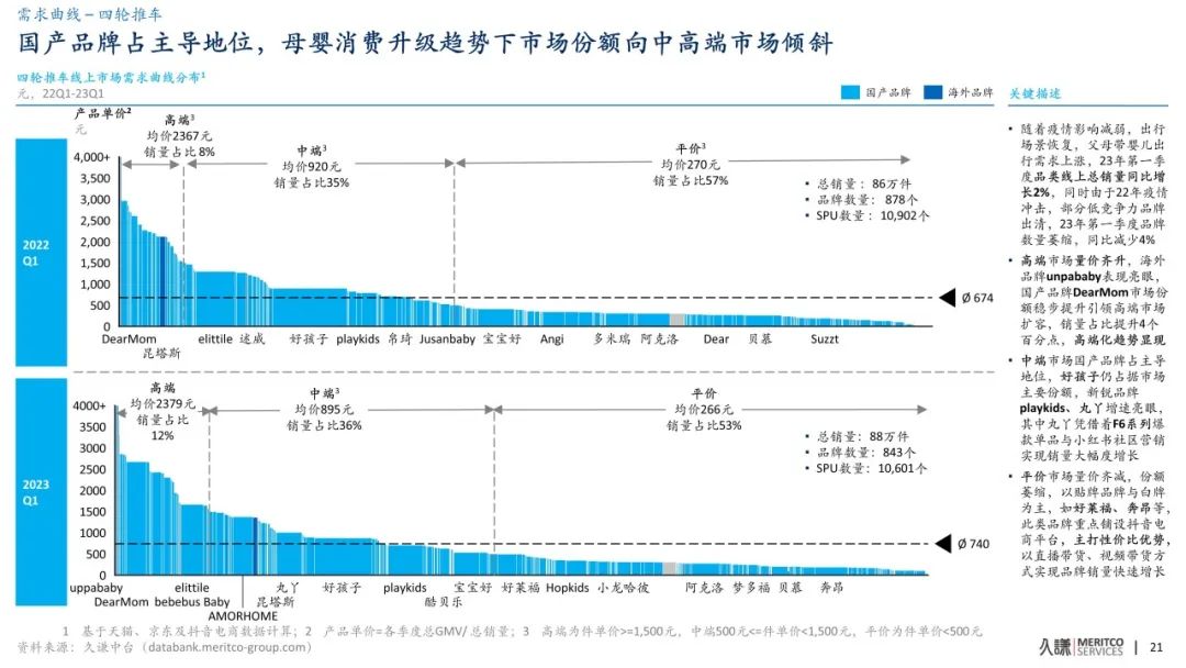 國產品牌佔據主要市場份額,品類線上銷售額TOP10均為國產品牌,其中新鋭高端品牌DearMom表現亮眼,趕超好孩子成為品類第一(23年Q1市場份額佔比8.8%、8.4%,同比分別上升5.8個、下降4.1個百分點)