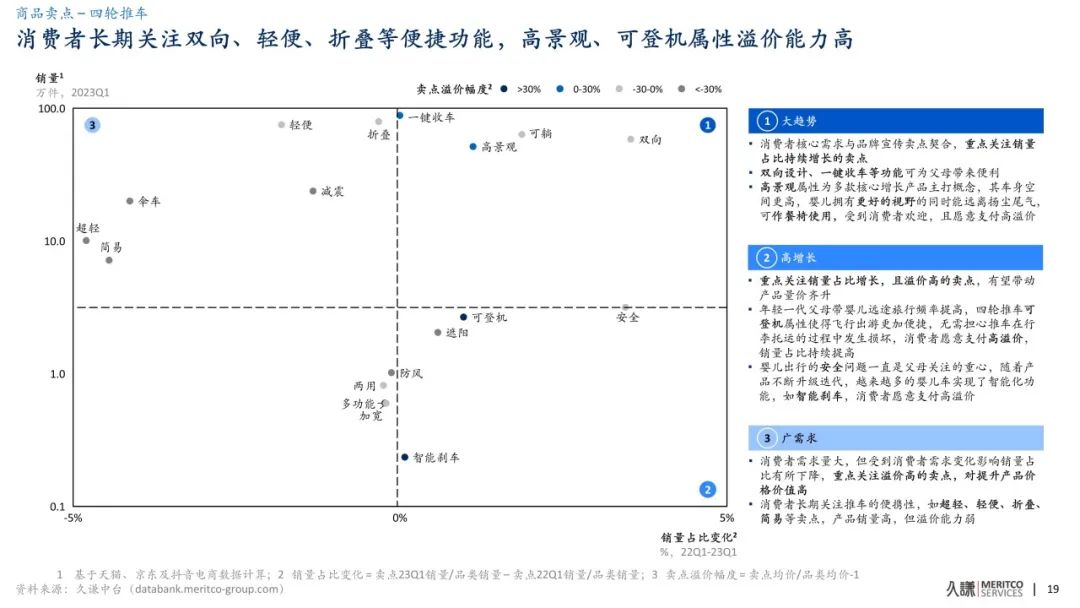消費者長期關注四輪推車的便攜性,如超輕、輕便、摺疊、簡易、雙向推行等賣點的產品銷量保持高位,一鍵收車具備較好的溢價能力