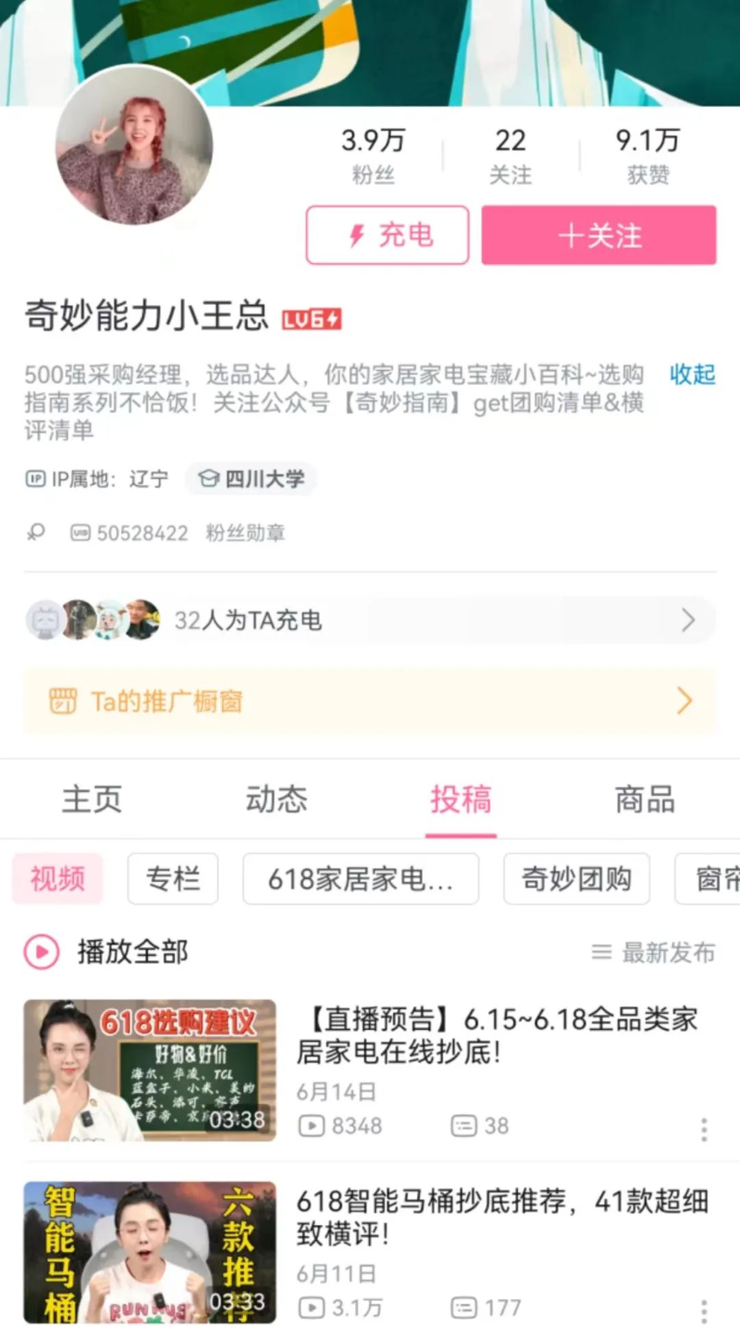 在直播帶貨方面,除了頭部UP主@Mr迷瞪今年618期間GMV破6億之外,百萬粉絲的UP主@大物是也,單場直播GMV超過500萬,僅有11萬粉絲的@大康測評,也取得過GMV1200萬的成績。