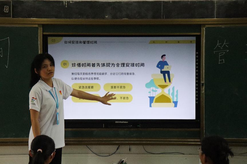一寸光陰一寸金,寸金難買寸光陰。課程首先從一個“1.2.3”木頭人的小遊戲引入,同樣的時間裏給人不同的感覺,讓同學們感受到一分鐘的奇妙之處。隨後,支教組成員鄭觀萍與同學們進行了一分鐘小測試,同學們紛紛積極參與,在活動中也驚訝到平常被忽視掉的一分鐘居然可以完成這麼多的事情。時間的確是上天分配給每個人絕對公平的東西,課程中鄭觀萍指出,要提高時間的利用效率,就要“根據自身情況合理安排時間,定製目標清單,集中精力完成緊急且重要的任務,珍惜時間也善用零星時間,做到今日事今日畢”。在場的學生們紛紛表示本節課程很有意義,聽後受益匪淺。過後要根據小老師講述的方法,結合自己的實際情況,制定屬於自己的時間計劃表,提高時間利用效率。