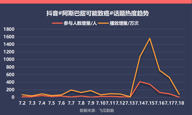 近30天,B站上關於“阿斯巴甜”的視頻數量新增近200條;抖音上發起相關話題參與人數超過2000人,視頻播放量達到近1億。微博方面#阿斯巴甜#相關話題閲讀次數已超過4億,引發4萬多次討論,熱度頗高。