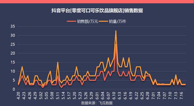 近90天內,**抖音平台[零度可口可樂飲品旗艦店]自7月14日後銷售額與銷量呈下降趨勢。7月14-7月18日,總銷售額峯值為15萬元,環比下降25%。**但因事件發生至今時間跨度短,樣本數據少,要論阿斯巴甜風波是否切實影響銷售數據,還要看此後更長遠的銷售數據。