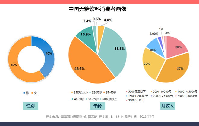 目前,國內無糖飲料主要消費受眾主要有兩大特點**:一是年輕化,主要為22-40歲的青年羣體,佔比高達82.1%。二是較強的購買力,**有數據顯示中高收入羣體為無糖飲料主要消費羣體;月收入50001-10000元區間消費者佔比最大為37.2%,佔比排名第二的為月收入10001-15000元的羣體,佔比26.5%,月收入5000元及以下的羣體位居第三,佔比為20%。