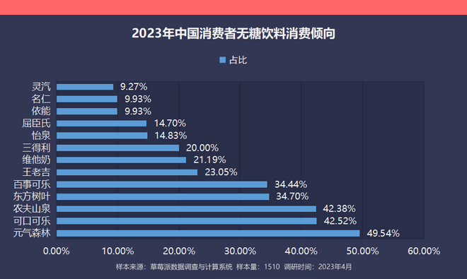 在消費選擇上,國內年輕消費者偏好選擇新鋭的品牌。在草莓派的一次調查顯示,無糖飲料品牌排名前三名的分別是[元氣森林]49.54%,[可口可樂]42.52%、[農夫山泉]42.38%。相較於另外兩個成立數十年之久的品牌,找到細分品類賽道的元氣森林或許更懂年輕人。