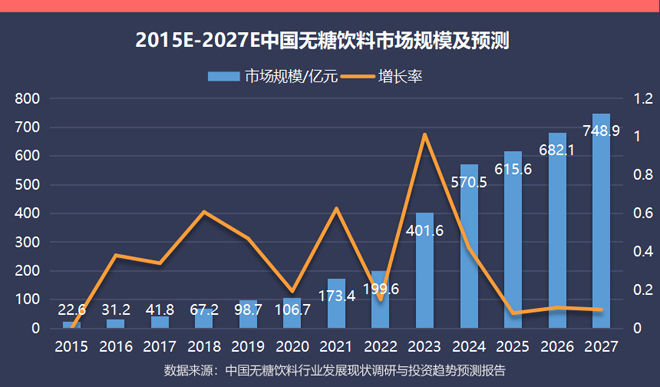 近年來,無糖、低糖已成全球健康飲食新標準,無糖/低糖飲料市場飛速發展。調研報告顯示,2015-2022年中國無糖飲料行業市場規模呈逐年增長趨勢,7年間增長區間在20%~60%左右,市場規模由22.6億元增至199.6億元。隨着消費者健康意識的不斷升級,預計2027年將達748.9億元左右。
