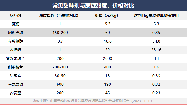 實際上,**阿斯巴甜並非無可替代的甜味劑,廣大廠家選擇阿斯巴甜的主要原因在於它的價格低廉,可以降低成本,獲取更大的利潤空間。**阿斯巴甜的甜度為蔗糖的150-200倍,達到1kg蔗糖標準所需費用僅為蔗糖的1/15。若企業選擇其他高成本更安全的甜味劑,無疑將提高生產成本,此後的新品價格也許會做出相應調整。