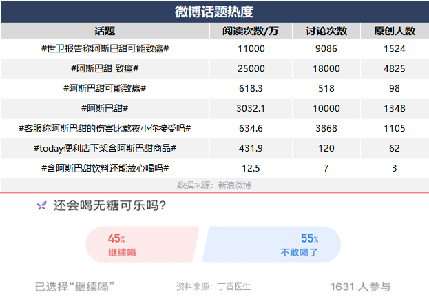 不過值得注意的是,在7月14日世衞發佈報告次日,相關話題熱度便開始迅速下降。而輿論方面,似乎也未出現”一邊倒“的情況。大多數網友站在理性角度看待此次阿斯巴甜的風波:認為“阿斯巴甜致癌還得看食用的劑量”。一則關於無糖可樂的投票結果顯示:1631人中有45%選擇[繼續喝],55%選擇[不敢喝了],基本保持在平衡的局面。可見目前相關討論雖然熱烈,但並未造成大規模的恐慌。