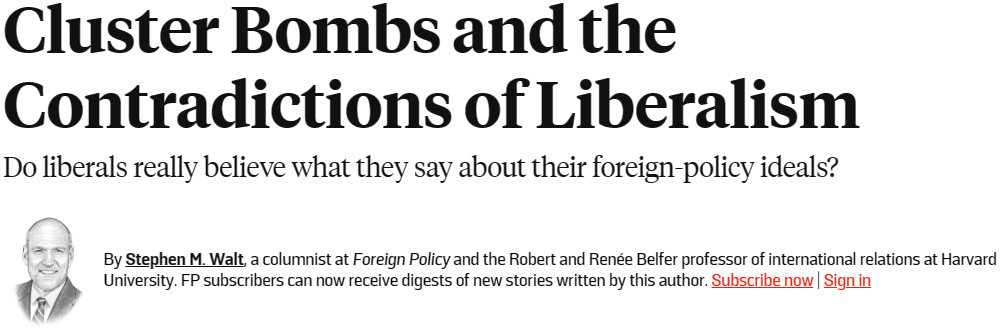 (作者是哈佛大學肯尼迪政府學院國際關係學教授。本文原題“Cluster Bombs and the Contradictions of Liberalism”,由《外交政策》雜誌網站發佈於2023年7月19日。譯者聽橋,對原文有多分段。)