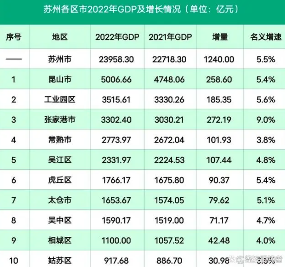 根據2022年數據統計,蘇州各區縣的GDP分別為:崑山市5007億,工業園區3516億,張家港市3302億,常熟市2774億,吳江區2332億,虎丘區1766億,太倉市1654億,吳中區1590億,相城區1110億,姑蘇區918億。