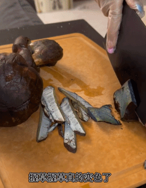 再回看視頻,才發現答案早在題幹中。在開始切片之前,這位網友曾用指甲掐了菌子一下。