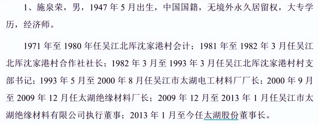太湖股份是新三板基礎層公司,2014年1月掛牌,全稱“蘇州太湖電工新材料股份有限公司”。其主營業務為電機、變壓器客户提供系統化的絕緣材料,產品全面涵蓋絕緣漆、表面漆、柔軟複合材料、雲母製品、玻璃鋼製品和層壓制品等絕緣材料及風電、高壓和高效節能電機線圈。太湖股份實控人施泉榮1947年出生,今年76歲,目前擔任公司董事長。