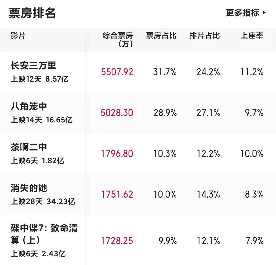 上映第六天,日票房下滑到第五位,較早上映的《長安三萬裏》、《八角籠中》仍保持着較高的票房生命力,位列前二;體量小、排片少的動畫電影《茶啊二中》,令人意外地在排片比低於《碟中諜》的情況下,日票房反超,位列第三;而第四則是已經上映二十八天的《消失的她》。
