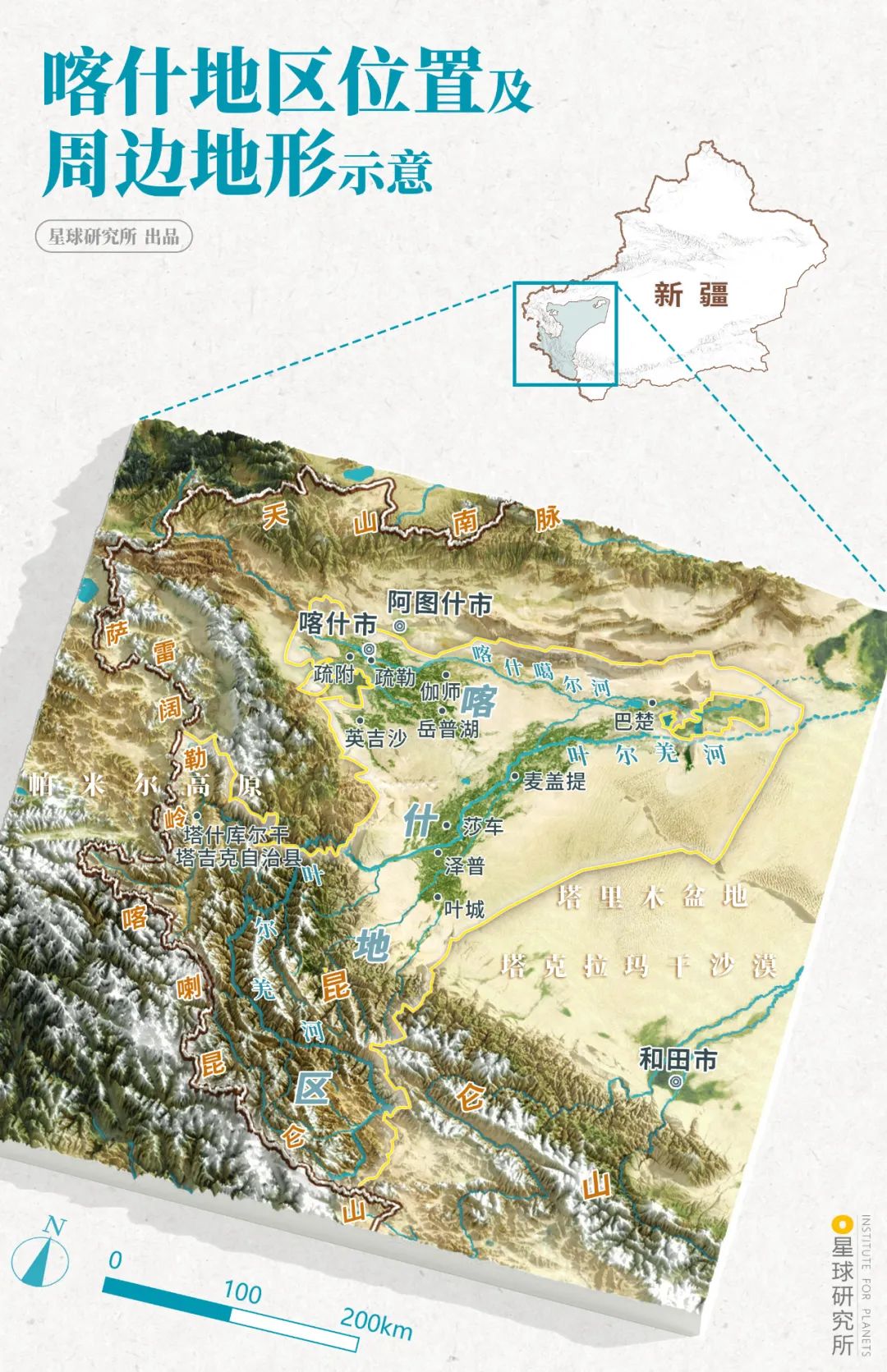 (喀什地區位置及周邊地形示意,製圖@高儷倩/星球研究所)