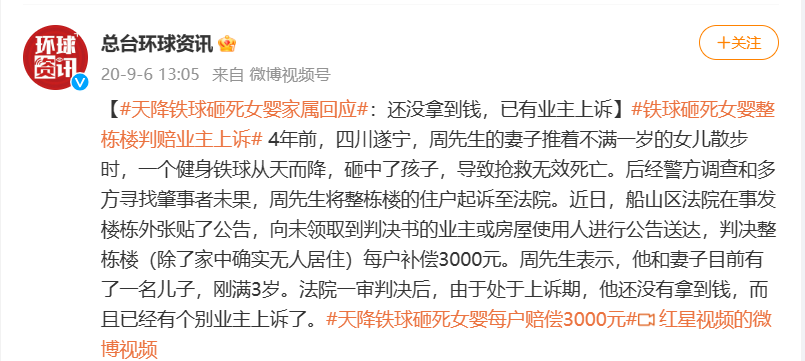 因為找不到嫌疑人,女嬰的父母將該棟樓的所有住户起訴至法院,要求賠償鐵球砸中嬰兒致死所造成的損失。一直到事件發生4年後的2020年,法院才最終宣判,除家中確無人居住的不承擔責任,其餘121户業主每户補償原告3000元。