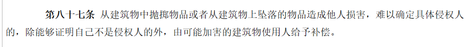 10年後,《侵權責任法》開始實施,其中第87條規定:從建築物中拋擲物品或者從建築物上墜落的物品造成他人損害,難以確定具體侵權人的,除能夠證明自己不是侵權人的外,由可能加害的建築物使用人給予補償。