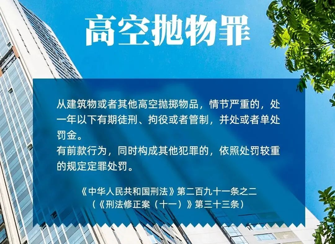 2019年11月,最高人民法院發佈《關於依法妥善審理高空拋物、墜物案件的意見》,規定故意高空拋物,即使未成嚴重後果但足以危害公共安全,依照以危險方法危害公共安全罪處罰。而《刑法修正案(十一)》新增了高空拋物罪,規定“從建築物或者其他高空拋擲物品,情節嚴重的,處一年以下有期徒刑、拘役或者管制,並處或者單處罰金。”