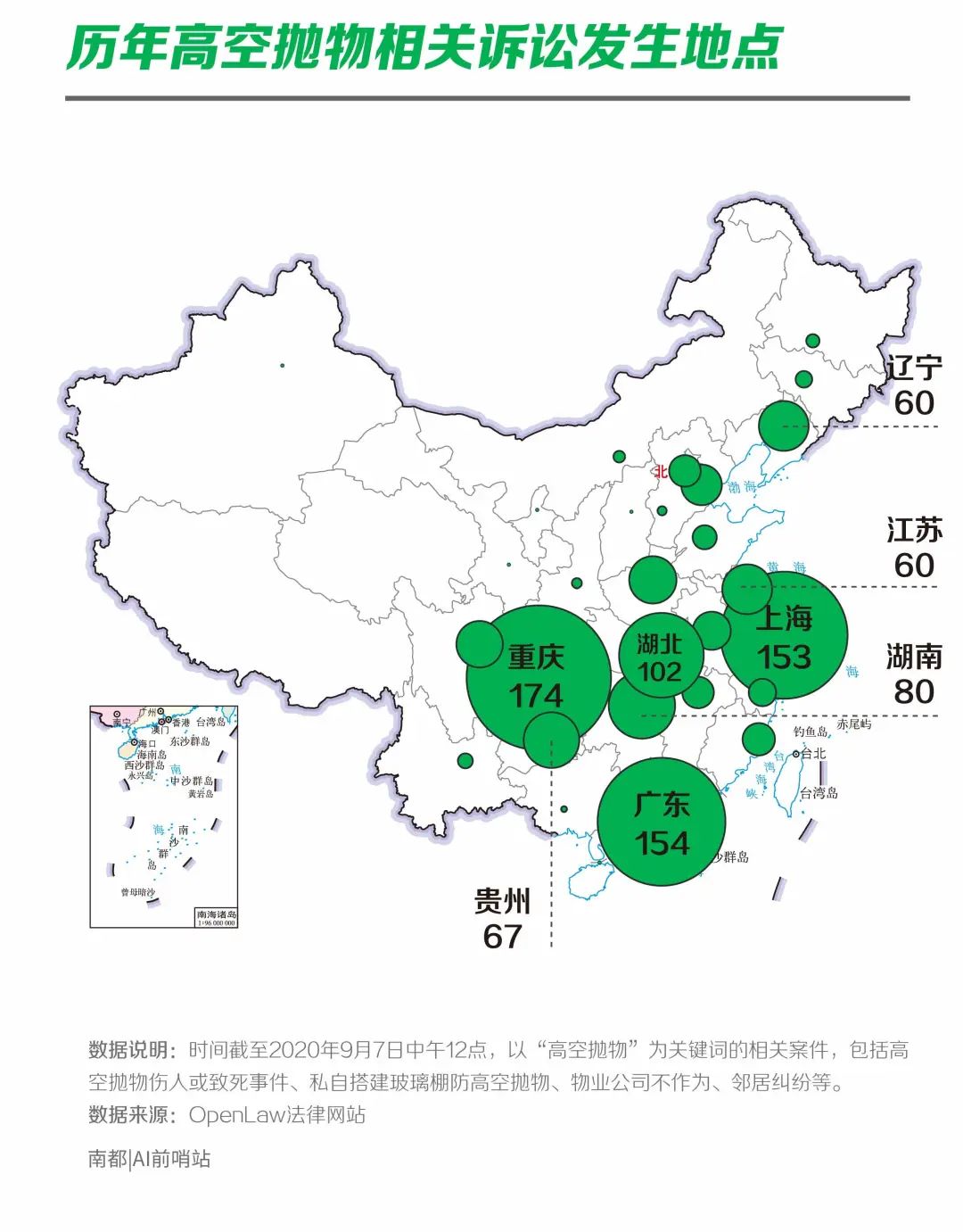 而從統計上來看,南方地區的相關訴訟較多,跟經濟發展不無關係。而據工人日報報道,重慶地區是高空墜物傷人案件的高發地區。在九龍坡區,相關部門平均每三天就會受理一起高空拋物警情。