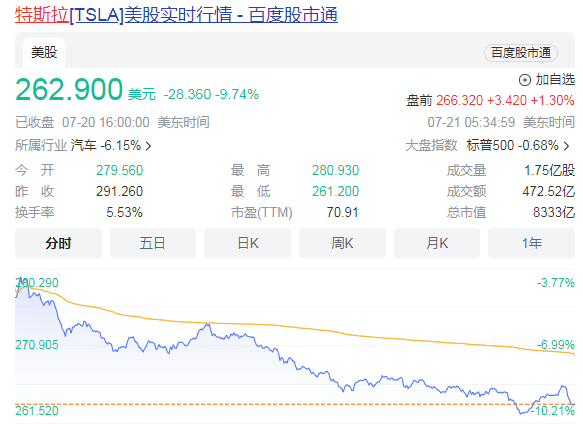 被視作特斯拉銷量關鍵的電動皮卡已經首車下線,但馬斯克沒有提到Cybertruck具體交付日期,一定程度上影響了投資人信心。截至美股7月20日收盤,特斯拉股價報262.9美元,下跌9.74%。