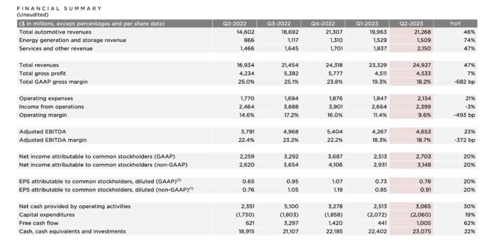 7 月 20 日,特斯拉公佈2023財年第二季度財報。特斯拉在產量、交付量和營收等方面都創下歷史最高紀錄,但價格戰也讓特斯拉毛利率再度降低,為16個季度以來最低水平。