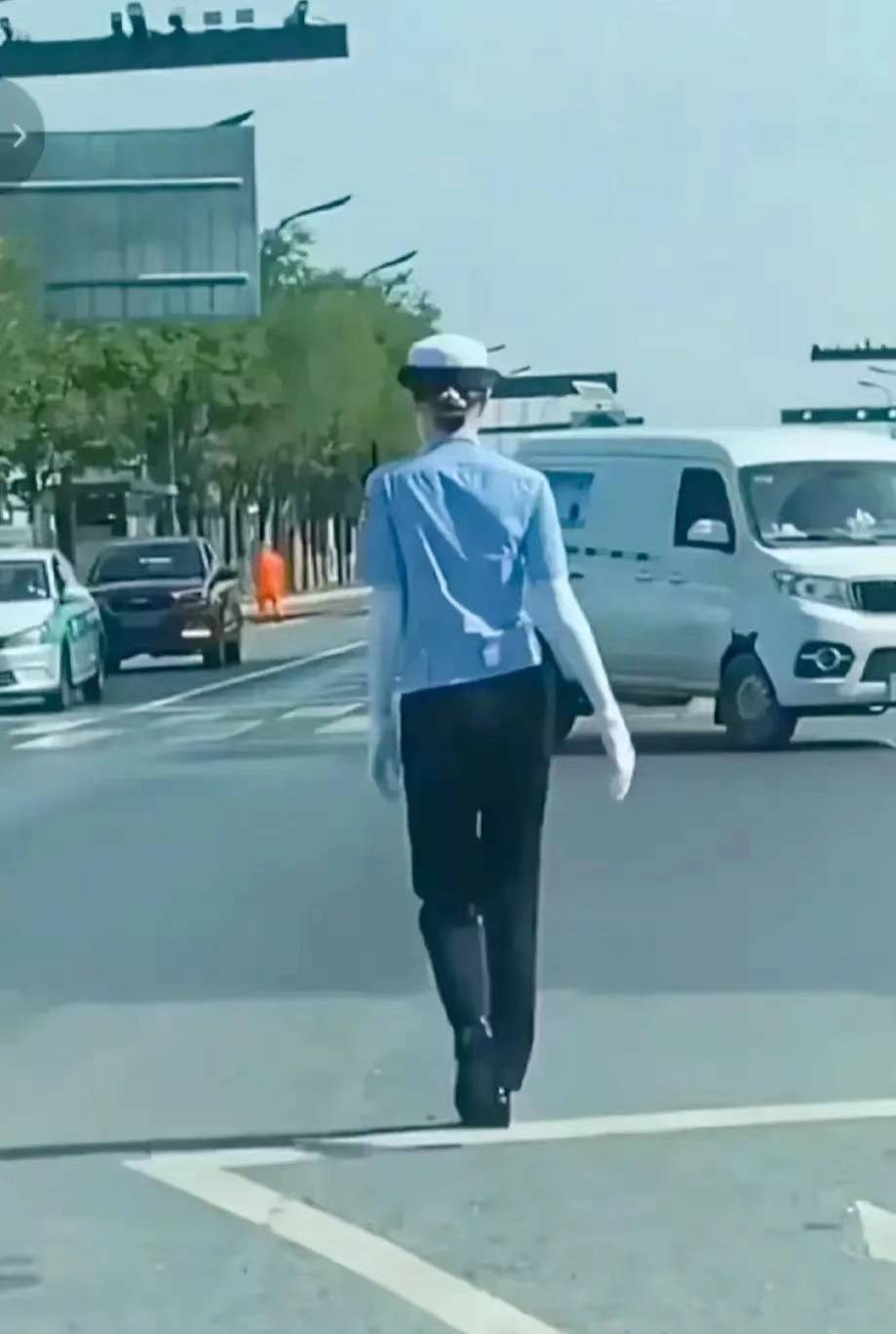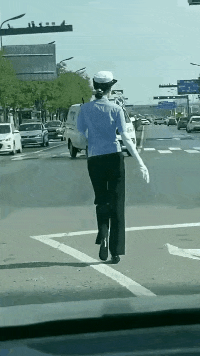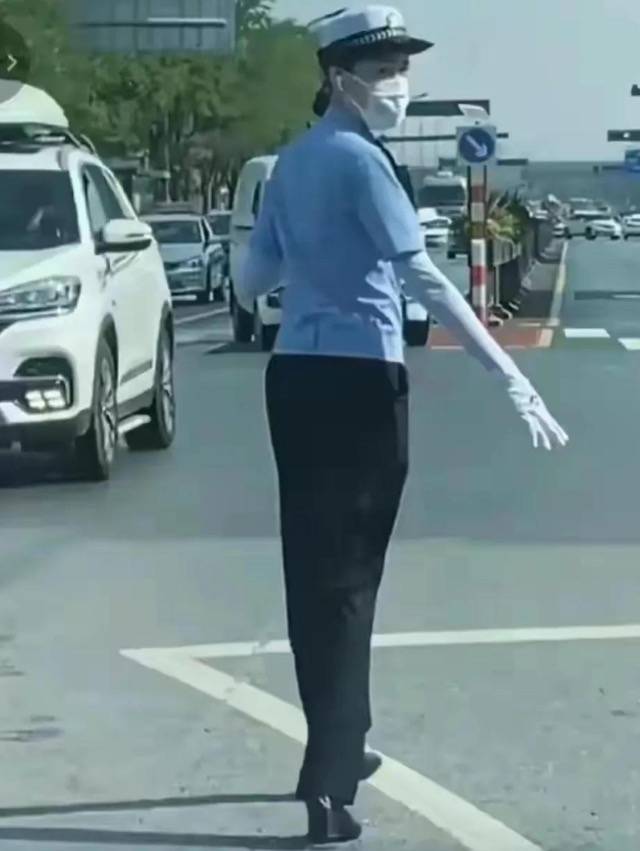 這交警穿的應該是坡跟鞋,要是細跟早被炒魷魚了,
