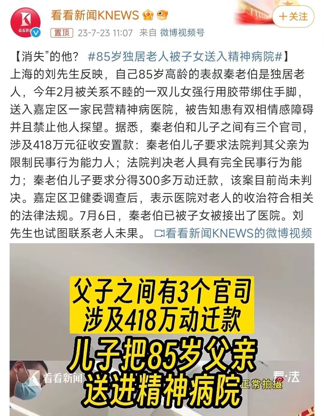 現實版“消失的他”!85歲獨居老人被子女“綁”進精神病院,不讓探訪音信全無_風聞