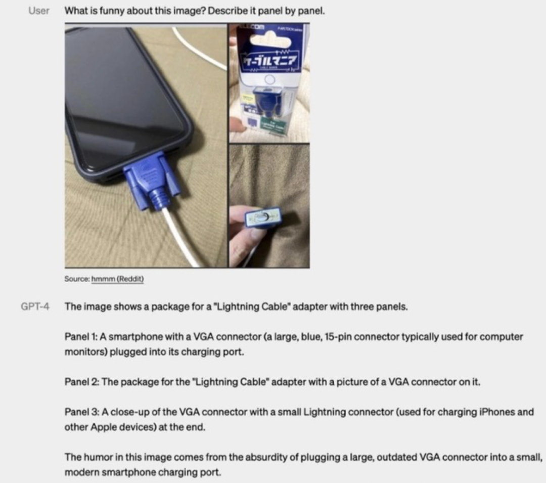 OpenAI 展示了一個事例:給 GPT-4 看一張照片,VGA 插頭造型的蘋果閃電 Lighting 接口,正插在 iPhone 上,提問這張照片有什麼好笑之處。