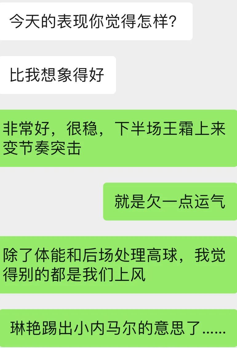 那時我跟幾個朋友聊起來,看場面都覺得信心十足,心想上半場穩一穩,下半場上王霜衝擊變節奏,就能拿下。