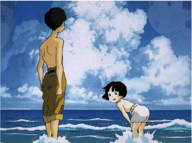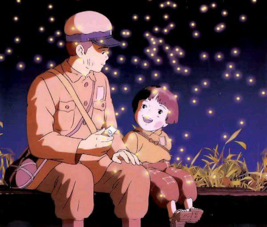 這裏邊唯一讓人同情的是代表日本女性的節子,雖然還是會因為各種事哭,要找媽媽,肚子餓,防空洞裏熱,但是都沒有鬧,只有在媽媽的衣服被拿去賣的時候才有哭鬧。其他時候還是做出一副很開心的樣子,整部電影總是能聽見節子咯咯咯的笑聲,(後面聽到這個笑聲就覺得心酸)哥哥不在的時候自己照顧自己,還給哥哥縫衣服,打掃衞生,但是她卻是依附哥哥而生的。一直都沒有告訴她媽媽已經死了的事實。而節子知道這件事後也是一副很懂事的樣子,就是這份懂事,才最讓人心疼。兩個人在末世相依為靠,糖果盒也是個線索,一開始遇上節子哭就有糖吃,到後來只有最後兩顆糖和一點渣子粘在一起,節子只舔了那一點渣子又把糖放回去,再後來拿糖盒裝水兑糖水喝,到節子吃玻璃珠,到最後用來裝節子的骨灰。如果説這是美化侵略者家屬的話,那麼只要是合乎邏輯的史實,就不能叫作美化。