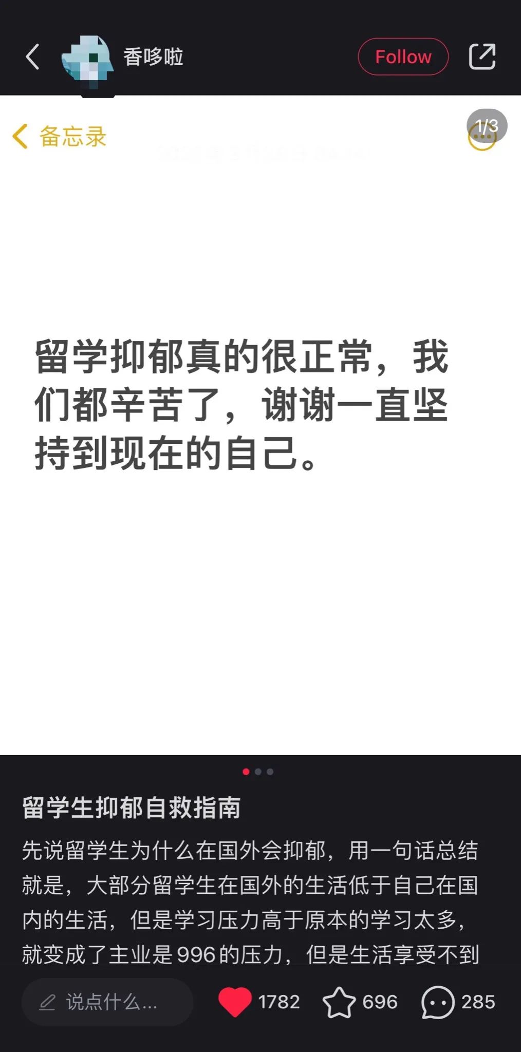 博主@香哆啦 發的貼子稱“留學抑鬱真的很正常,我們都辛苦了,謝謝一直堅持到現在的自己。”