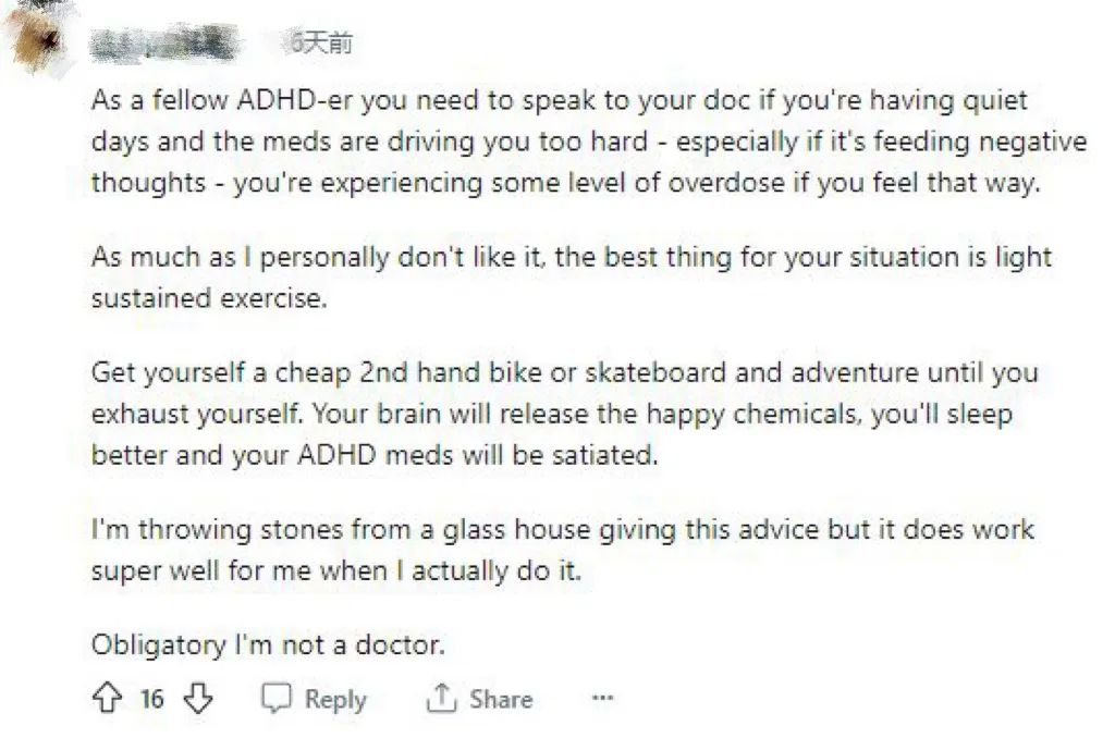 有網友認為作為一名多動症患者,如果每天都過的很平淡和安靜,並且藥物產生的刺激太大,那麼你需要去看醫生,尤其是當你產生一些消極的想法的時候。