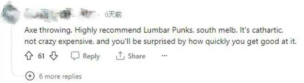 有網友説可以去玩斧頭投擲,南墨爾本的 Lumbar Punks。你可以在這裏宣泄情緒,而且玩這個也不會非常貴。墨妮卡就去試過這個,真的很解壓!趕due的小夥伴很是需要去發泄一下!