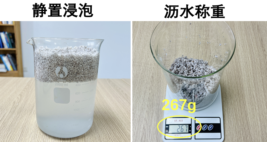 買來的**園藝珍珠岩,**我們也取50g做浸水實驗。按照浸水、靜置、瀝水、稱重的流程走完後: