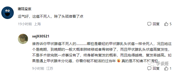 當然,甲狀腺癌依然是癌症,不要輕視它。在相關評論區,可以看到一些得過該病或者親友患過該病的網友分享了他們的經歷。