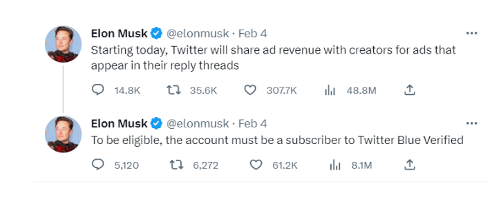 無奈之下,馬斯克也只能臨時取消推特認證。但在今年2月份,馬斯克再次發文稱,將和創作者分享廣告收入——前提是,創作者通過藍V認證。另據相關媒體報道,今年2月份推特正在考慮向希望保留金V認證徽章的企業用户收取每月1000美元的費用。