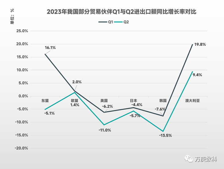 對比我國部分貿易伙伴在2023年Q1與Q2的進出口總額增長率,可以發現各國家/地區的Q2增長率皆小於Q1,充分表明近期我國進出口貿易面臨較大壓力。其中,東盟的增長率變動最大,由Q1的16.1%降至Q2的-5.1%,縮減超21%,作為我國當前最大體量的貿易伙伴,對Q2整體外貿狀況影響頗深;澳大利亞增長率縮減也較多,由19.8%降至9.4%,但仍保持正增長。