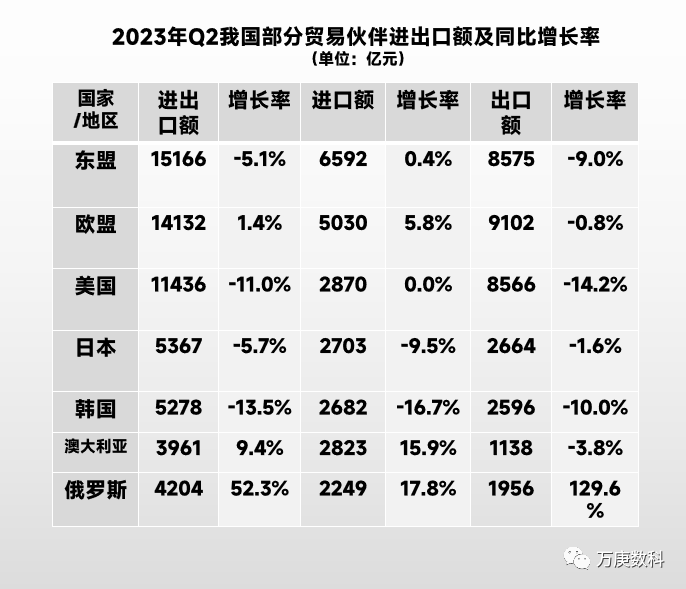 從2023年二季度我國部分貿易伙伴的進出口總額及增長率來看,超過5000億元的五個國家/地區中,除歐盟小幅增長1.4%外,其餘四個國家/地區皆為負增長,其中韓國、美國負增長百分比超兩位數,分別為-13.5%、-11%。而與我國進出口貿易額在5000億元之下的澳大利亞和俄羅斯則有較多增長,特別是俄羅斯增長率達52.3%,使我國在二季度與其貿易額達4204億元,超過澳大利亞。若下半年延續該走勢,俄羅斯與我國在2023年的總貿易額有望超越日韓,在我國對外貿易中的重要性進一步提高。