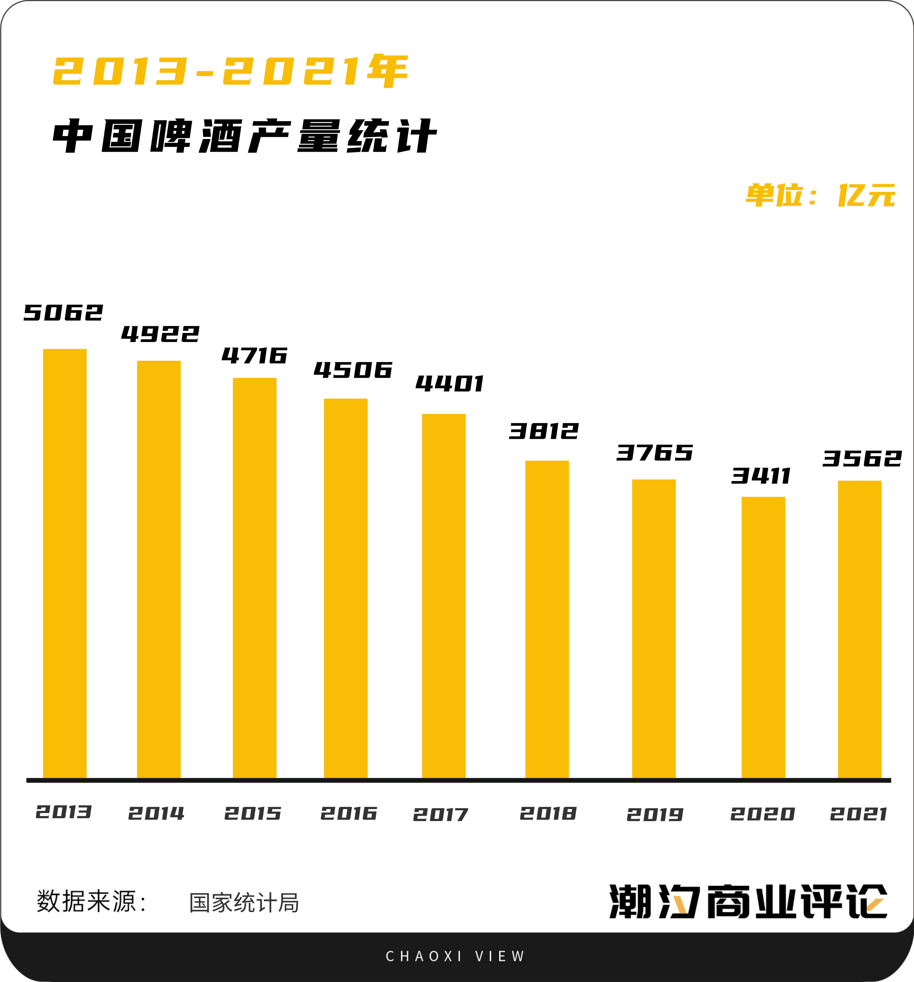 我國經濟經過近些年的飛速發展,人均可支配收入也不斷增加。投射在啤酒市場,在經數十年發展,中國啤酒行業的品牌集中度越來越高,啤酒市場也已經進入了成熟期。 根據國家統計局數據,2013年我國啤酒產量約為5062萬千升,達到歷年啤酒產量的最高點,此後,我國啤酒生產量開始連續下滑,到2020年啤酒產量已降至約為3411萬千升。