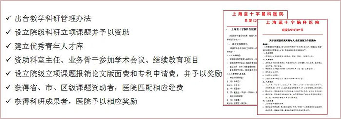 作為以“專家建院、技術立院、創新興院”為發展方針,致力於創建現代化、國際化、專業化的腦科醫院,上海藍十字腦科醫院始終重視學科建設和人才培養,先後設立學科建設專項基金,先後出台教學科研管理辦法,設立院級科研立項課題、建立青年人才庫等,為人才搭建成長平台,學術研究蔚然成風。2019年以來,醫院累計4項科研課題獲得市、區級衞健委立項,結題2項。