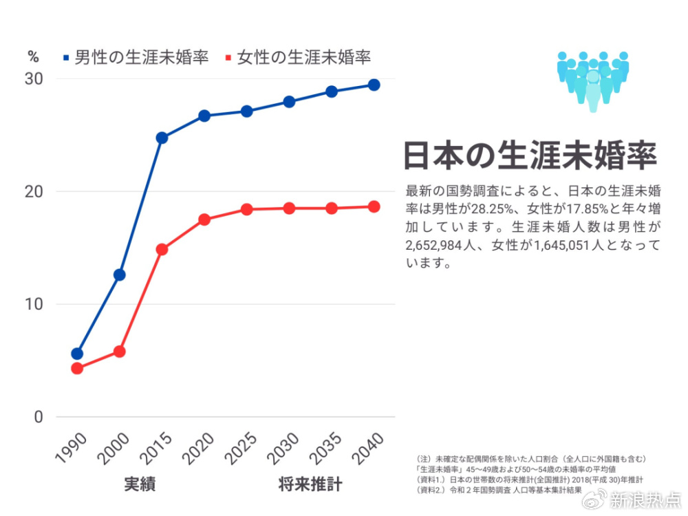 據日本國立人口和社會保障研究所的調研顯示:2020年,50歲前還沒有步入婚姻的男女比例分別達到了32.4%和28.3%。事實上,自從上世紀八九十年代泡沫經濟崩盤,人們的結婚意願就急速下降,這個數字一直在不斷上升中。
