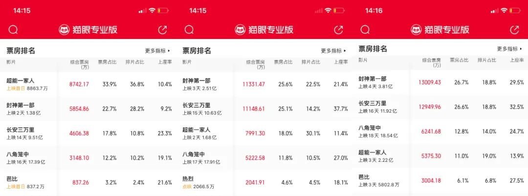 7月10日,《超能一家人》釋出最新預告時,豆瓣“電影票房”小組有人發起了票房預測投票,結果70%的人都認為票房會在15億以上,僅6%的人認為票房會低於10億。從上映檔期來看,《超能一家人》也佔盡了“天時”,《長安三萬裏》《八角籠中》都已經上映兩週,《封神第一部》則因為口碑分化、吸引點不足被鑑定為“撲街”,《超能》則被賦予了重新點燃暑期檔熱情的重任,上映首日排片佔比高達36.8%。