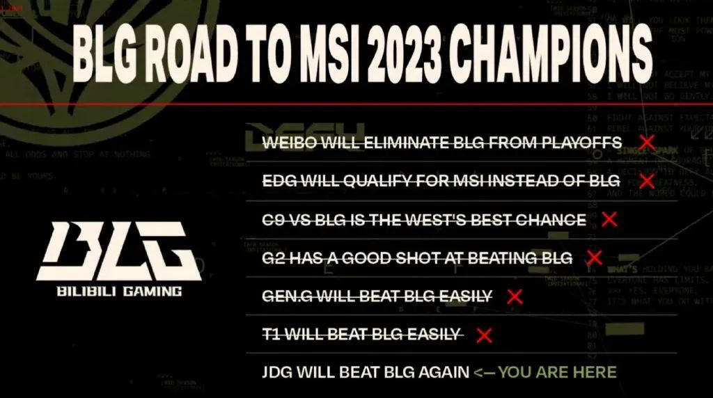 而在MSI的比賽過程中,BLG淘汰韓國隊GEN和T1兩場尤其精彩。在對戰GEN前,前《英雄聯盟》人氣選手Doinb預測BLG將被1:3大比分淘汰。沒想到,BLG以3:0的成績碾壓GEN,打得對手無力招架。這也是LPL賽區(中國區)的戰隊時隔1084天,再次以3:0戰勝LCK賽區(韓國區)的戰隊。