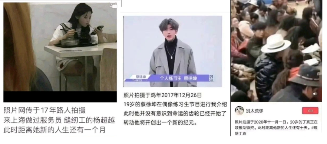 這些圖片裏,能看到還在上海當服務員時的楊超越、正值 20 歲領取物資的丁真、以及第一次説出:“ 全民製作人大家好,我是練習時長兩年半。。。 ”的蔡徐坤。
